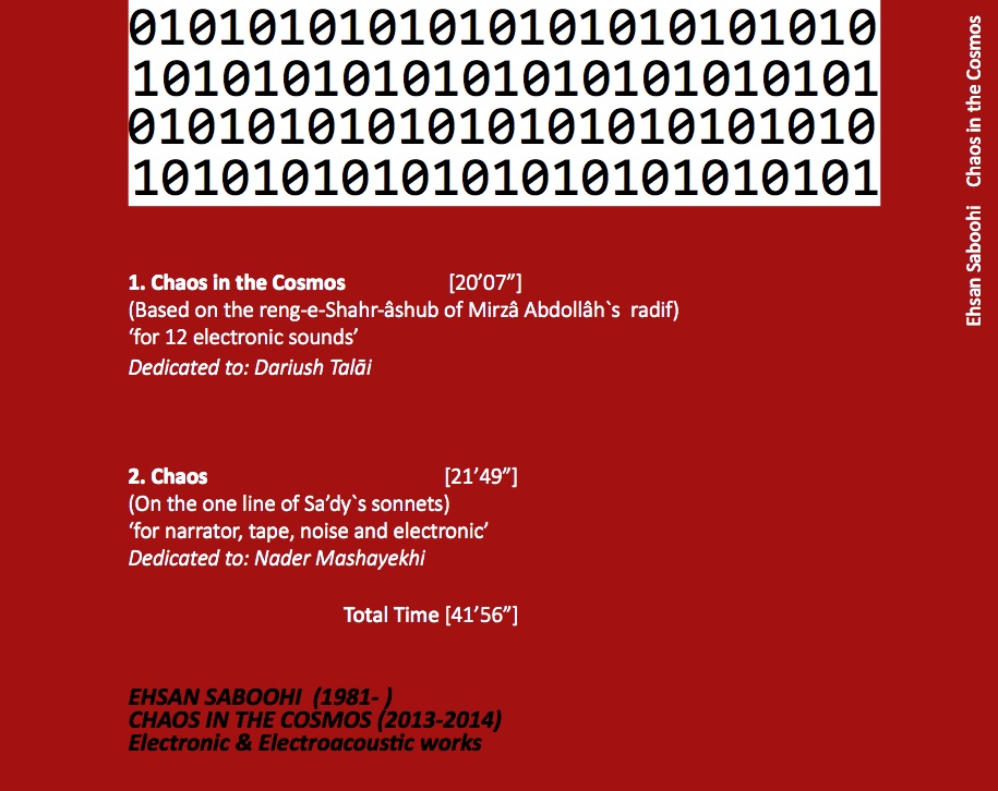 From Mr. Saboohi: “Chaos in the Cosmos” (Shahr-âshub in Persian) is an experimental music inspired by the well-known components of Iranian culture such as literature, miniatures, calligraphies and the art of carpet. Being aware that meta narratives have no place in today’s world, it is aimed to be a micro narrative of the Persian traditional poetry and music.