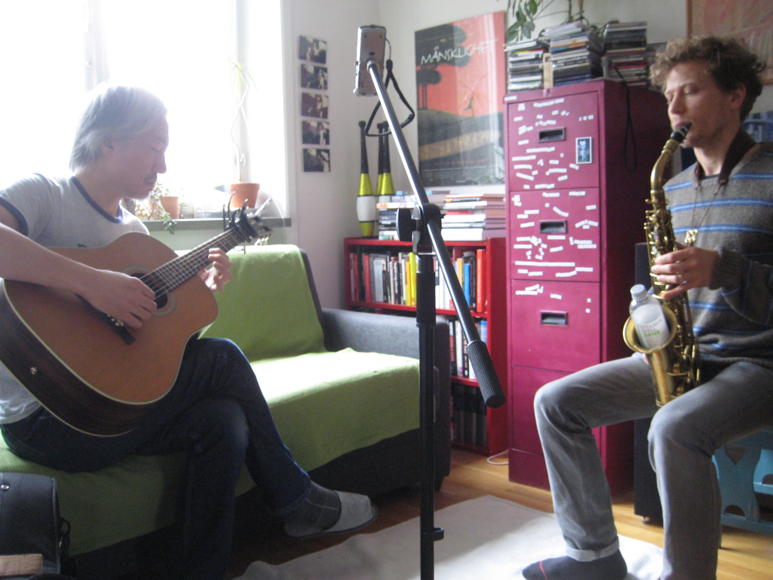 This is the unedited outcome of the impromptu meeting of Tetuzi Akiyama on acoustic guitar and Johan Arrias on alto saxophone, on a Sunday morning in a minuscule Stockholm living room. Having toured and recorded together years before in a quartet format with the formidable Gul 3, the musicians knew each other well, but this was their first duo session.No preset parameters here. After a glass of black coffee and slightly diverging words on the structure - one long piece or shorter ones? - Johan shoves a plastic bottle down the bell of his alto, Tetuzi strokes a string, and they’re off. No distinct melodies or rhythms, yet the music flows with a gentle insistency and retains a strong sense of direction and purpose throughout, its beauty heightened by moments of dissonance. At times reminiscent of a koto-shakuhachi dialogue, the core feeling is one of deep trust and respect. Every note, every sound counts. In the room, in the moment. Slow breathing, just as Tetuzi had suggested.